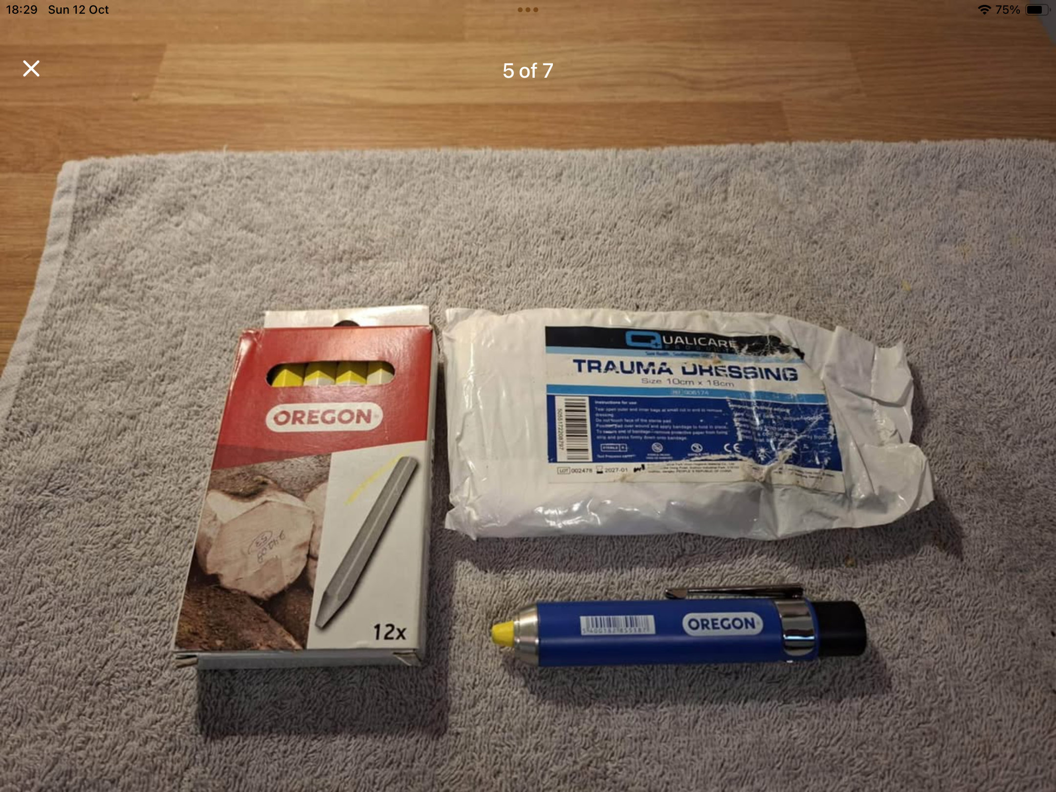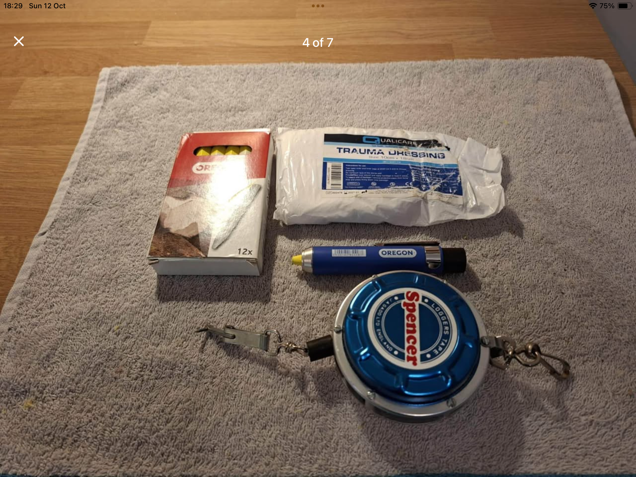 Loggers tape measure, marker crayon, crayon holder and field dressing.
