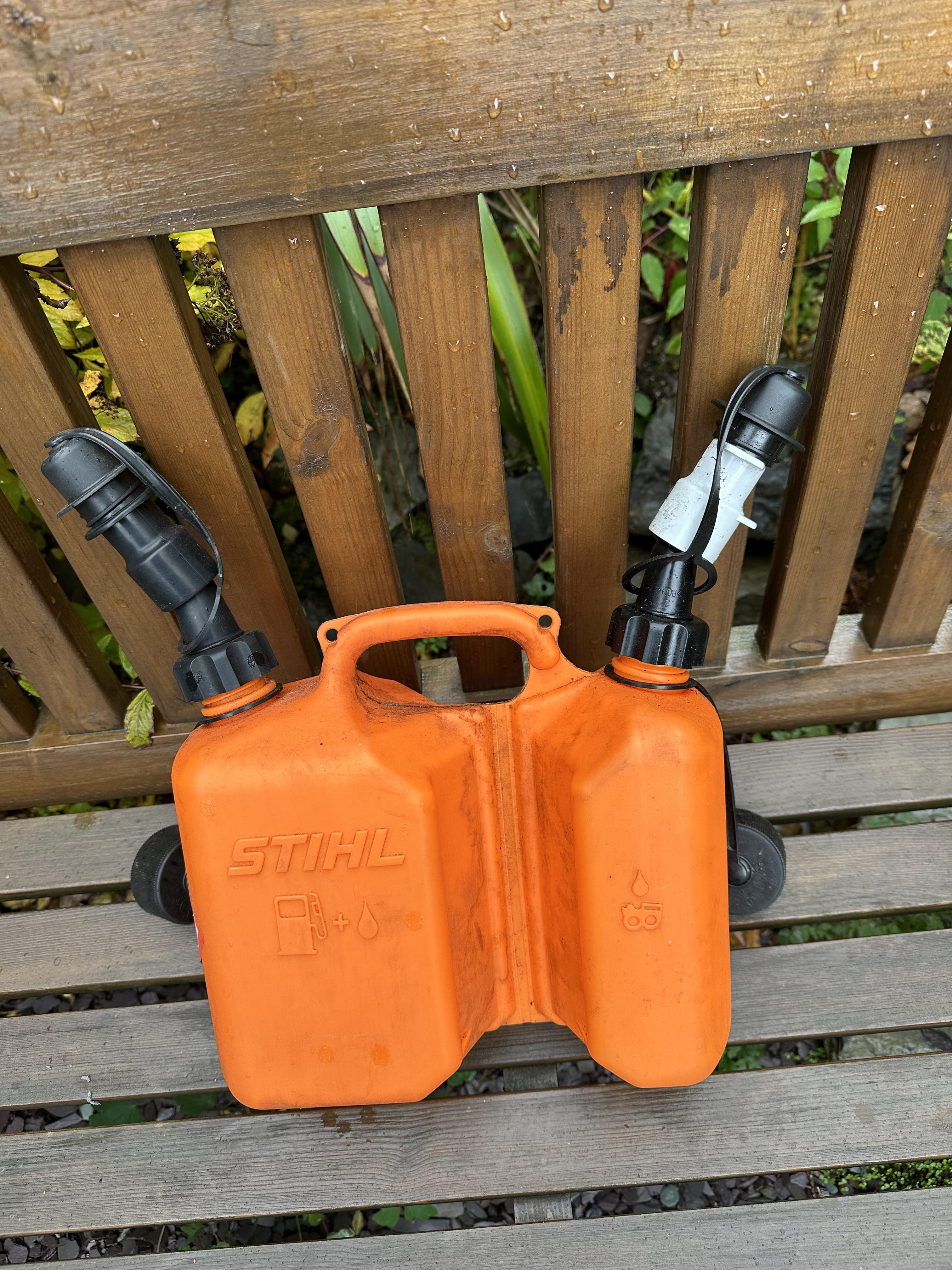 Stihl combination canister - petrol + oil compartments - with cut-off spouts for both