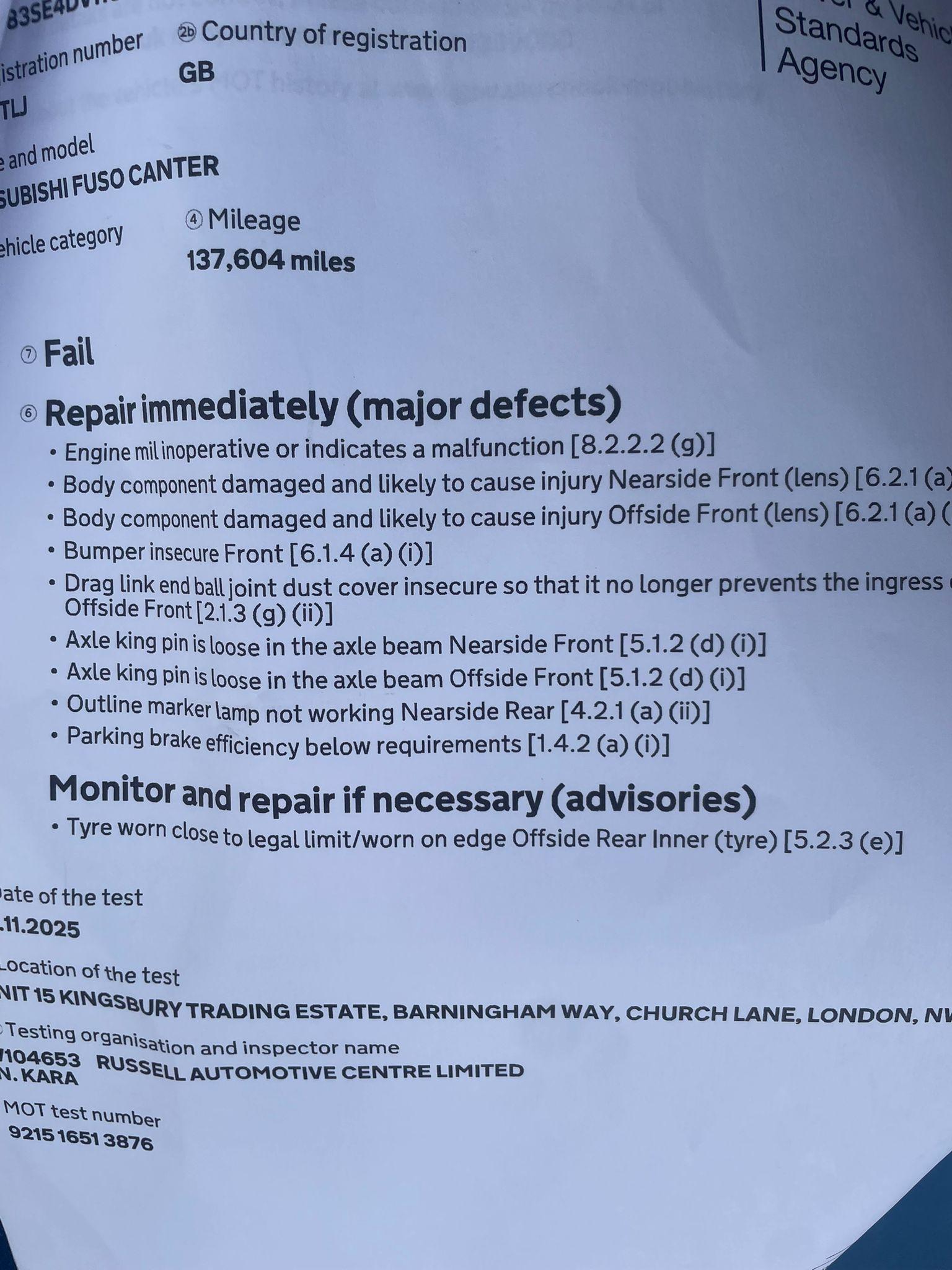 Selling my Mitsubishi Fuso Canter as it has recently failed its MOT. Please check the photos for full details of the failure points.
