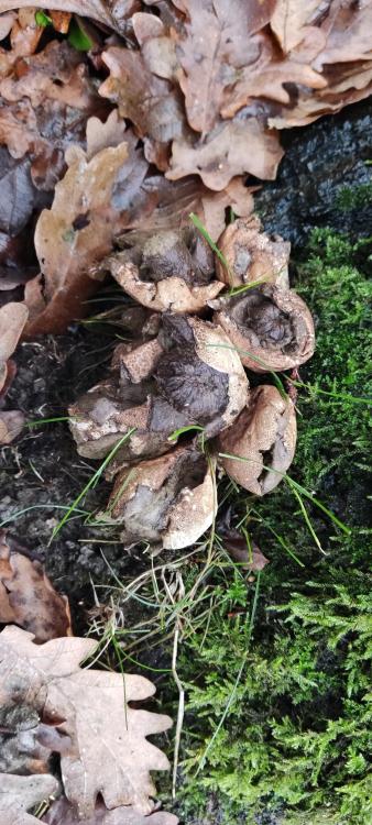 Looking at an oak today, noticed this fungi on a buttress root. When touched, there were visible white spores released. Looks like they are well past their best, is it possible to identify them from the photo?