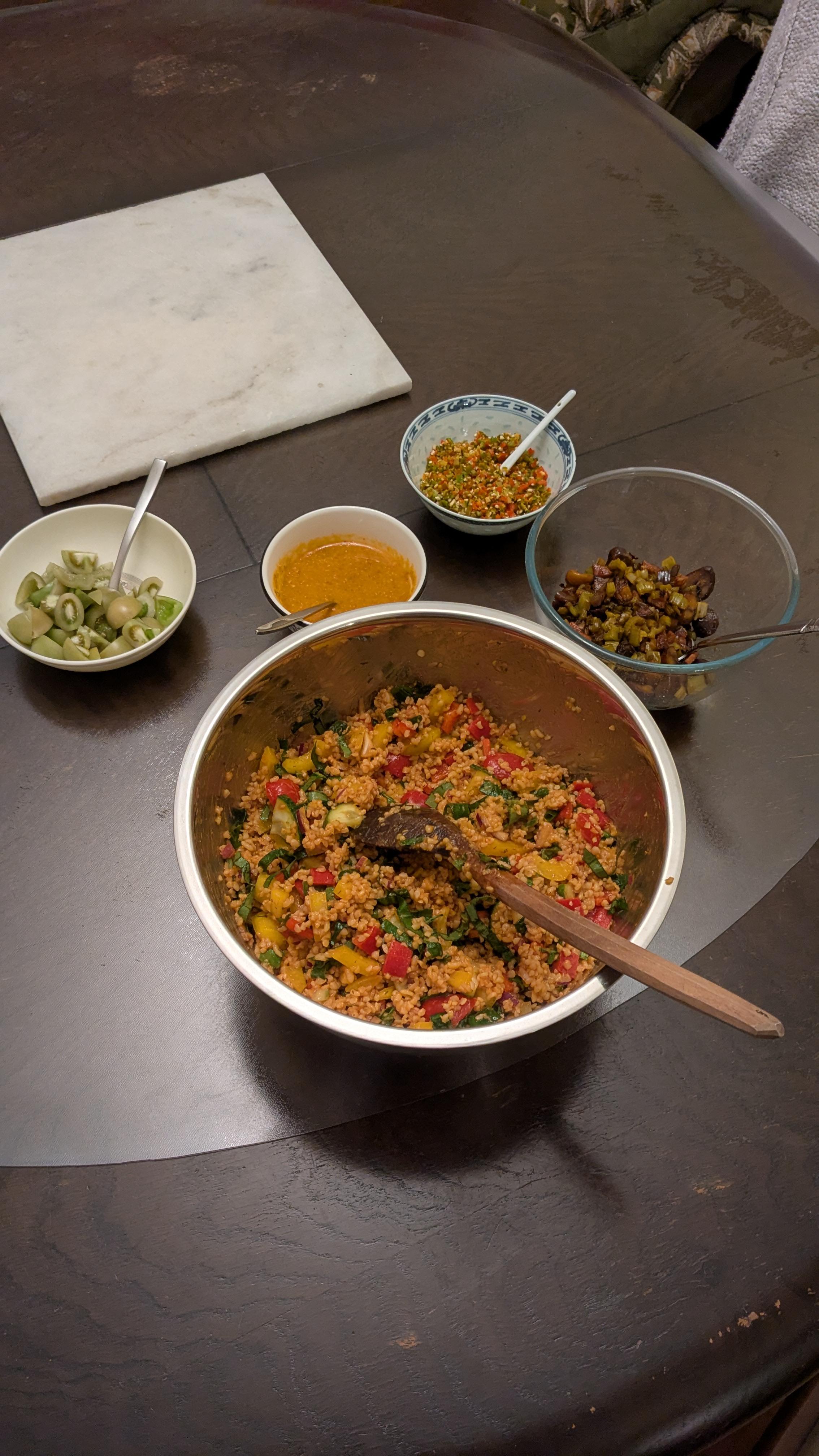 6. Turkish chicken thing with sumac and sesame. With a bulgar salad and a couple of forms chilli. Plus fried chorizo, chard and chestnuts. Got to be my favourite way of doing chicken. Dead easy, dead quick, dead tasty.