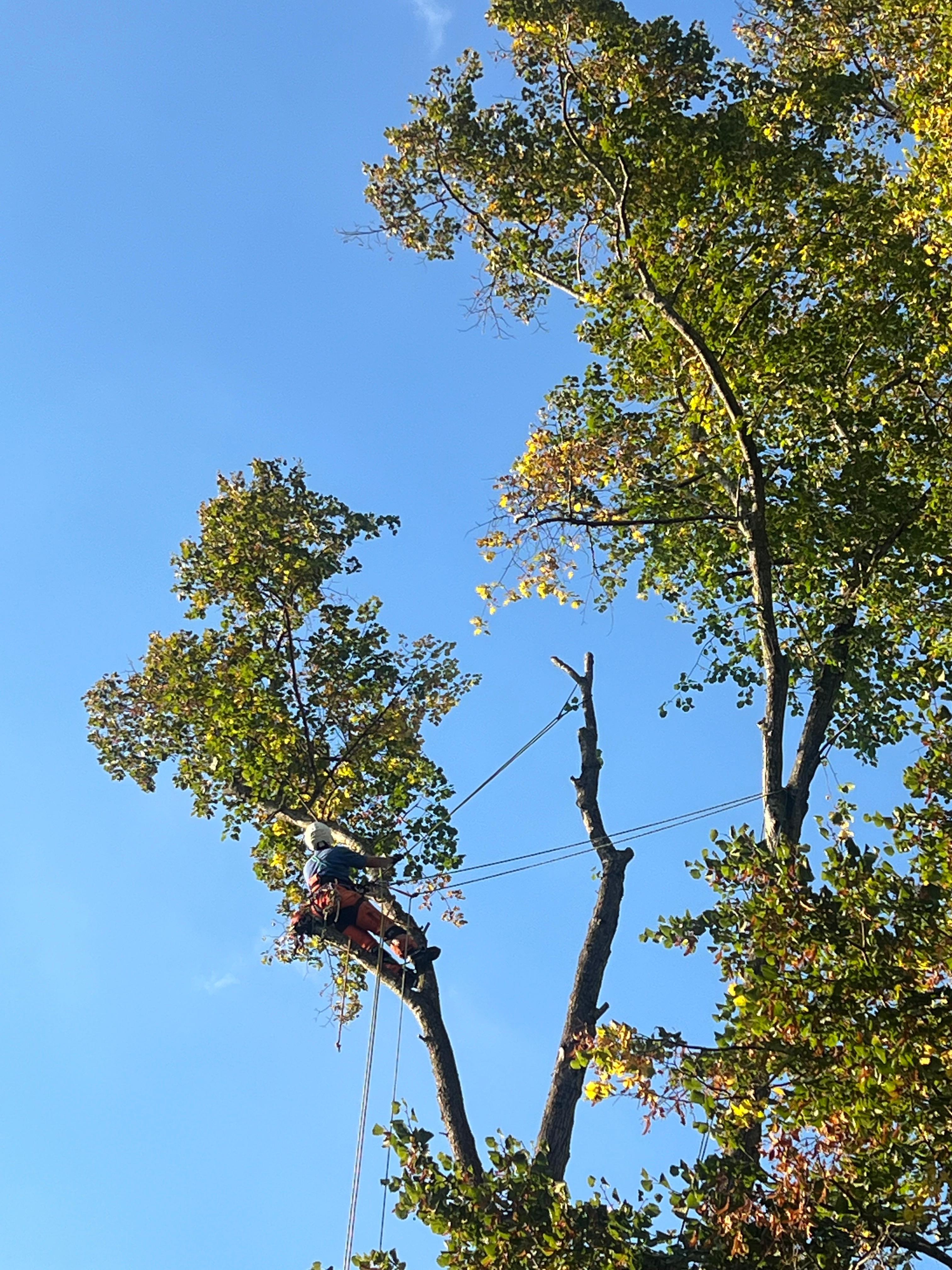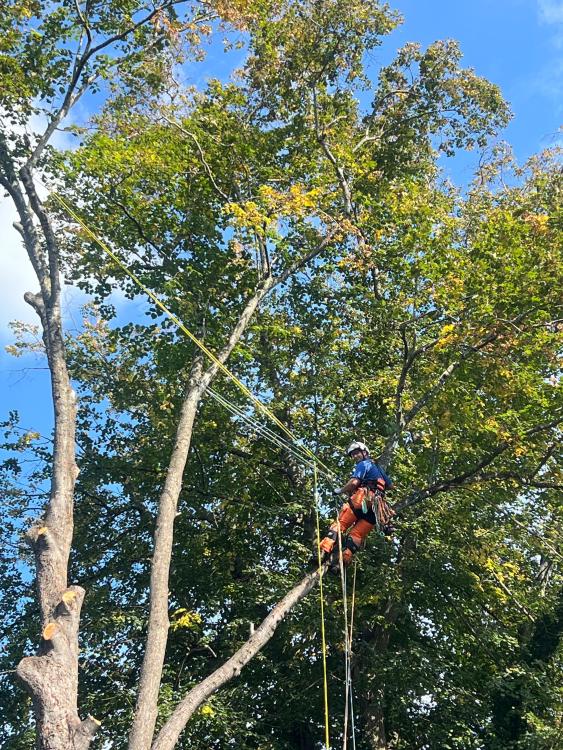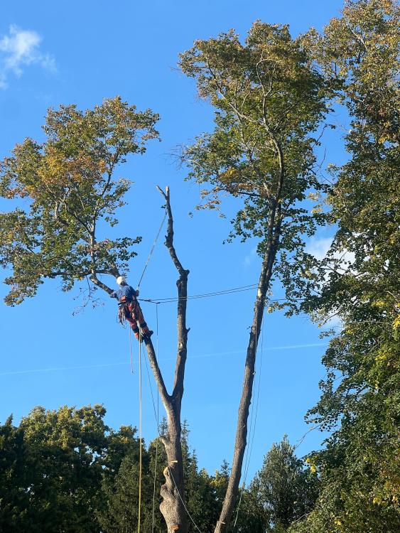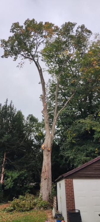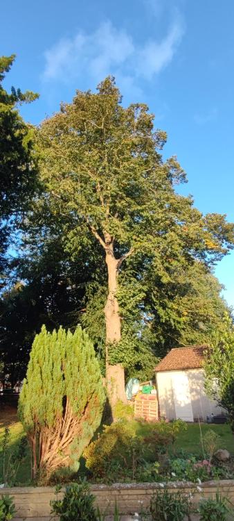Down. Even without the rot you've found, they've got a short life anyway. Quick livers and quick diers, pioneer species. They usually get to about 14" and then snap off or die. That's how I soften the blow to a client. Right then. Rig with mother. How are you going to do it?