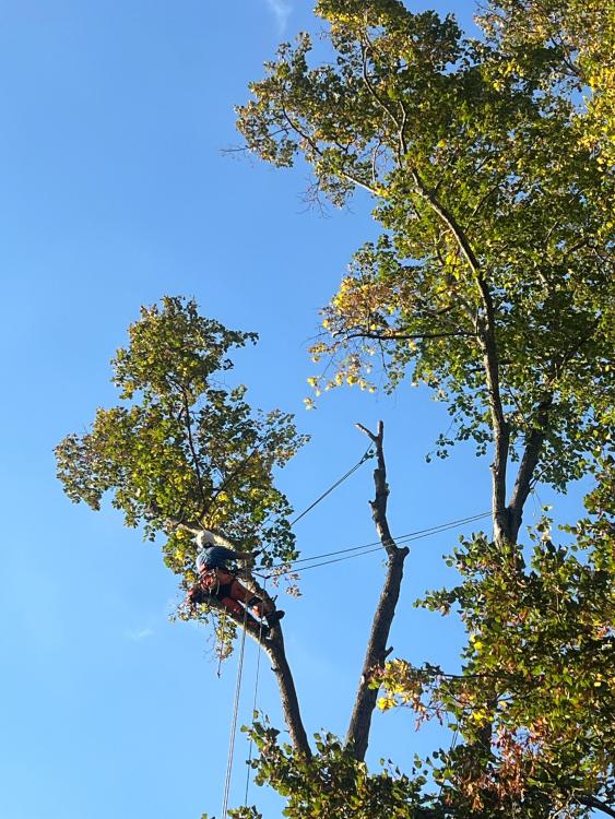 The relatively large lime that I started dismantling a week ago, "small job" for a friend. I've been doing it it half day at a time as I havent felt like doing early starts recently! I was intending to fell the stem, which was too wide for my bar. Due to the rubbish and poor escape route I opted to cut the sides narrower so It could be done from one side. I then discovered it were hollow and I wouldnt get a proper hinge in the direction of lean. Its a heavy lump, so that only left chogging it down in small peices using spikes and a ladder. Currently looks like this, with the stump to come down as low as possible and all the logs cut smaller for firewood, except the two large arch sections that they want as garden furniture. Going back after lunch and should finish it today.