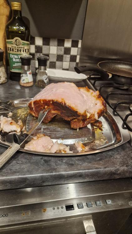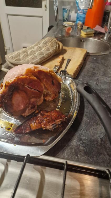 Cooked a ham, crackling not over good mind. Eat some tonight, leave Tom some for during the week and freeze a load of slices for 'Ron.