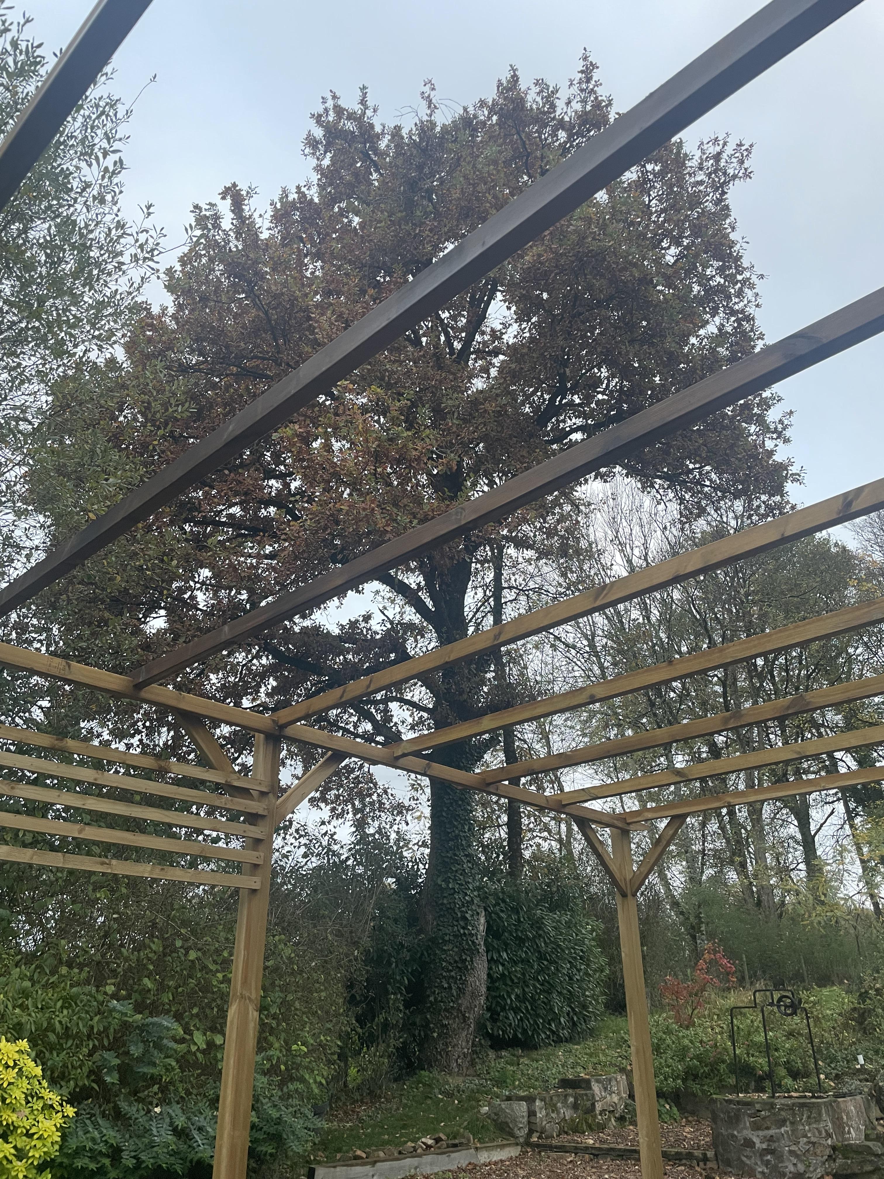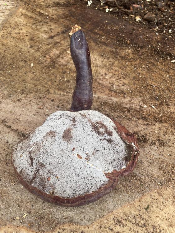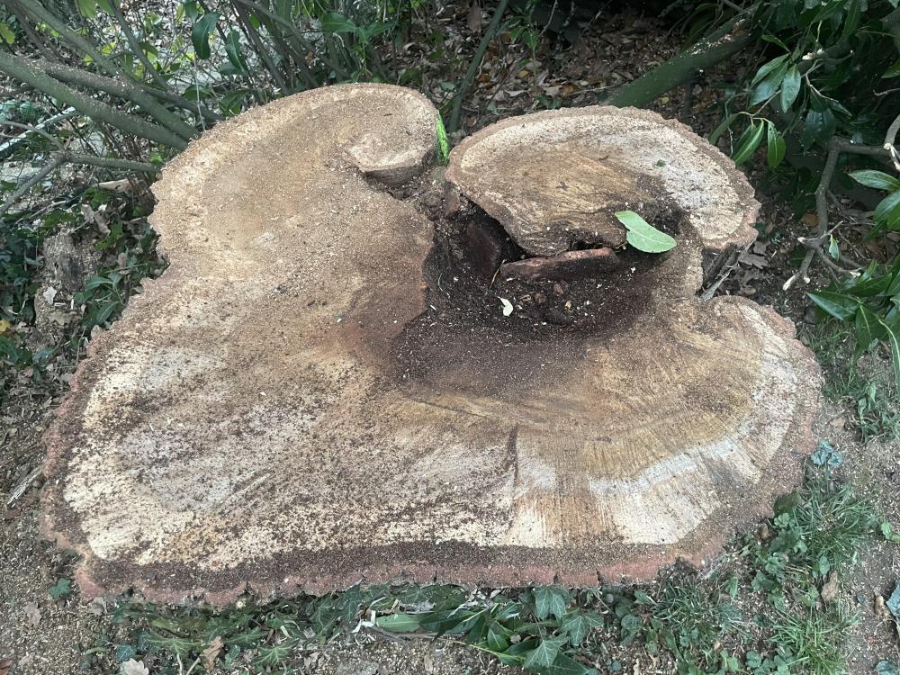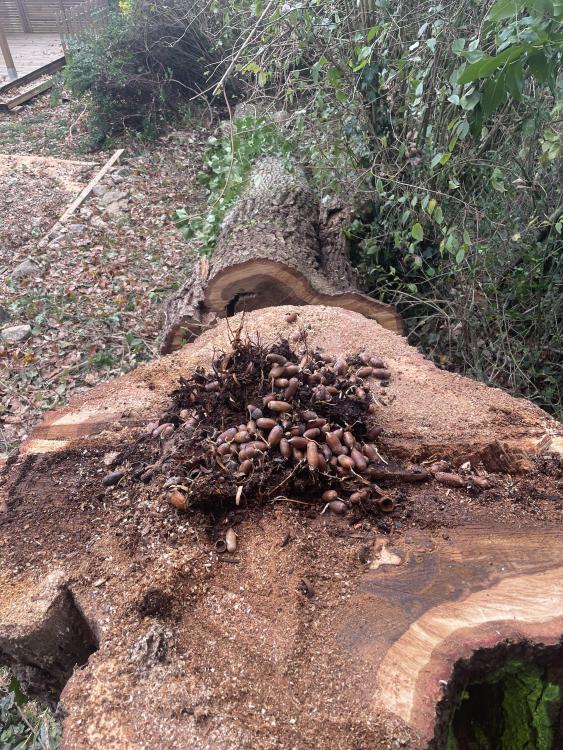 Straight forward Oak dismantle with a bit if rigging to swing the branches in and avoid the vintage car on the other side of the hedge. Felled it at waist height due to metal and a cavity full of broken roof tiles. Centre was hollow and full of acorns, no doubt squirrelled away for winter, and the first time that I have come across Ganoderma Lucidum, a really rather rare fungi.
