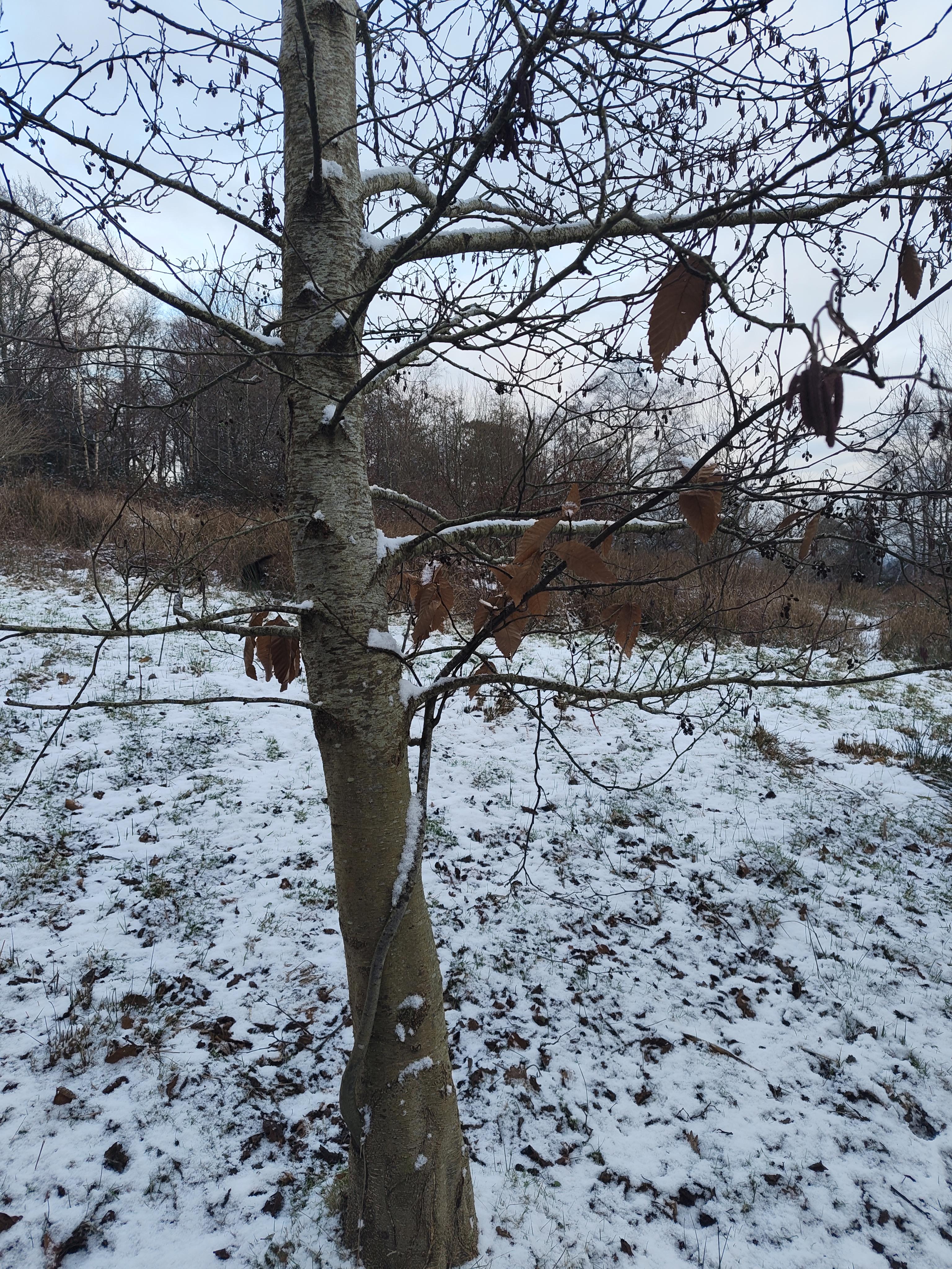 Is it a bird? Is it a plane? Stopped by this tree in my woodland today and instantly recognised the sweet chestnut leaves. Then it struck me as odd because I hadn't planted any there and none of the others were that big. Also, it looked like alder bark. It's definitely an alder but there's a sweet chestnut growing out of it. Must've been a small hollow where a nut was stashed. Wonder how long they'll stay like this? -