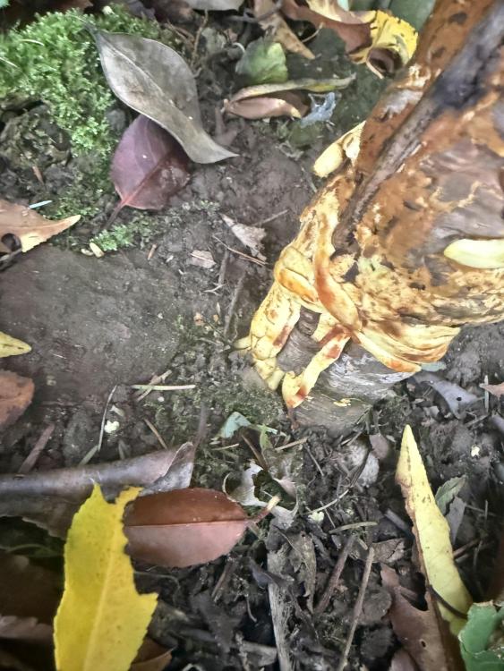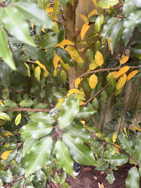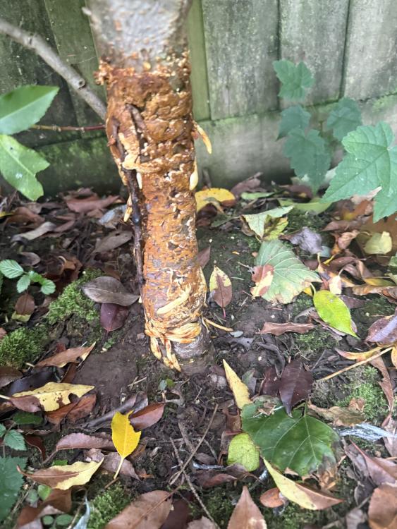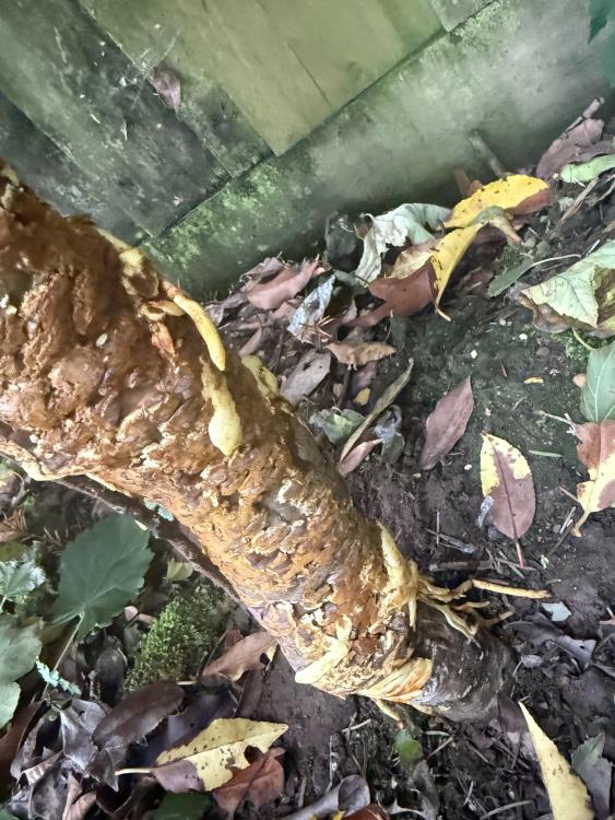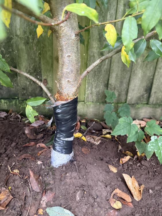 hi, hoping somebody can help. i planted a row or laurels a couple of years ago and during the summer, about 4 months ago, i was strimming the grass and caught the base of the tree. I don't think much of it but had a look and somehow it had stripped the bark all the way around about 3 inches up from the base for about an inch gap. A full ring! A quick google spelt certain death for the tree so I read on and found that you could bridge the gap and it may take. im not a garden person at all, but I delicately took a small branch, and began the process of bridge the gap. I also shaved the bark of the branch and made thin strips that a place across the gap. It looked a bit like a Frankenstein job but I had a bridge and wrapped the gap with fresh bark all within about an hour. I then proceeded to wrap it with cling film and taped it up waiting. it seemed to have survived, I figured it would last weeks but months later it was ok. This week I noticed it was the only tee with yellow leaves, with the exception of the odd area on the row of trees. Fearing the worst I removed the cling film and tape to reveal this..... I have no idea what it is. i quickly wrapped it again and then pulled some soil onto the base as I guessed they may be roots forming and be hunting down to soil. does anybody have any suggestions or is this a lost cause? IMG_0353.mov