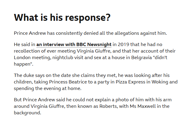 For legality, she was 17 and in the UK so it was all 'legal', however he was mid thirties so definitely not something that you can defend. As to what Roberts was told to do, not sure Andrew was the instigator in those demands or whether Maxwell and Epstein were the only ones demanding she slept with him as a 'gift'. So legal in the UK... but nothing you can defend I reckon. Like Trump I reckon he knew exactly what Epstein was up to, and is complicit in those crimes also by his silence.