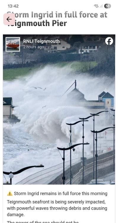 Good webcam action. Being next to the sea during a storm is one of the most exhilarating things to do I reckon. Mind you they've had it a bit too rough in the left hand corner of the south coast these last couple of days. Storm surge plus high tides has been bad news down there. Teignmouth Pier washes away and sea wall crumbles during Storm Ingrid WWW.BBC.CO.UK Part of a historic pier washes away and a sea wall next to a railway line crumbles as Storm Ingrid lashes Devon and Cornwall. Funny thing is I was right there at new year and the sea was like glass, never seen it so calm and flat.