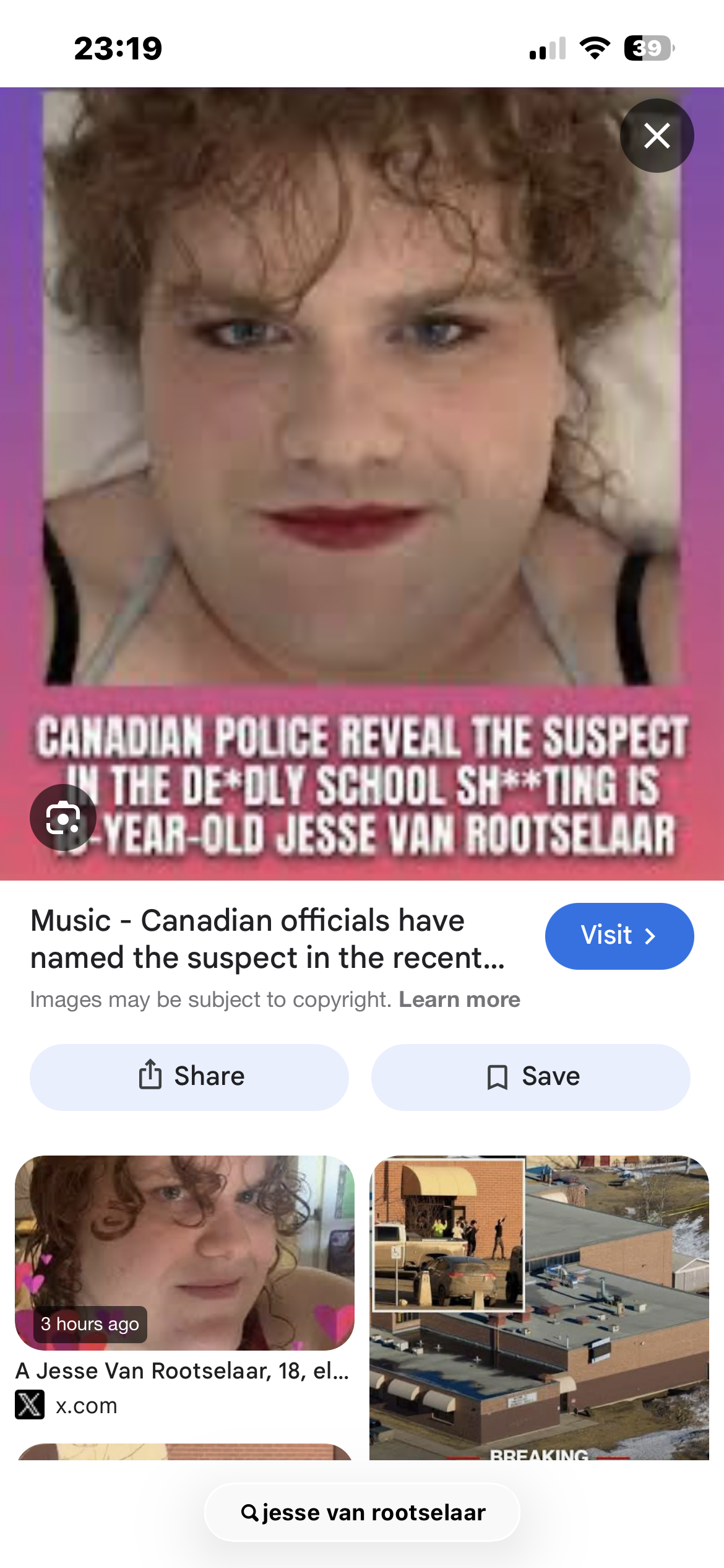 God bless the crumbling, rambling and confused internet. The Canadian shooter is called Jesse Van Rootselaar. You google image search that and obviously someone's paid google to not have pictures of some bestubbled tranny at the top. The image results do however include pictures of someone with a similarly south African ish name, who appears with both his own headline and the shooter's.