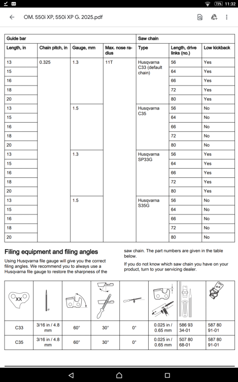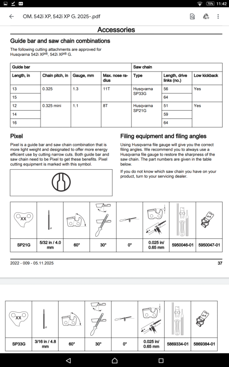 One amendment i would make to the above post is that the 542i seems to be sold as standard in the UK with SP33G in 1.3 gauge needing a 4.8 mm file, that is how i have seen it and used it.....however.....it can come with SP21G in 1.1 gauge needing a 4 mm file. That may, perhaps, be the standard sold in France so bear that in mind as regards my last point above and my apologies if that is the case as it undermines some of the last points made as regards the bar and chain set ups between the 542i and 550i being interchangeable. They are...but only at 1.3 gauge. Personally having used the 542i with the 1.3 gauge chain, the clutch gave it the grunt to chog through what i was cutting with no problems at all and i think a 1.1 gauge on it is a waste on a saw of that calibre.