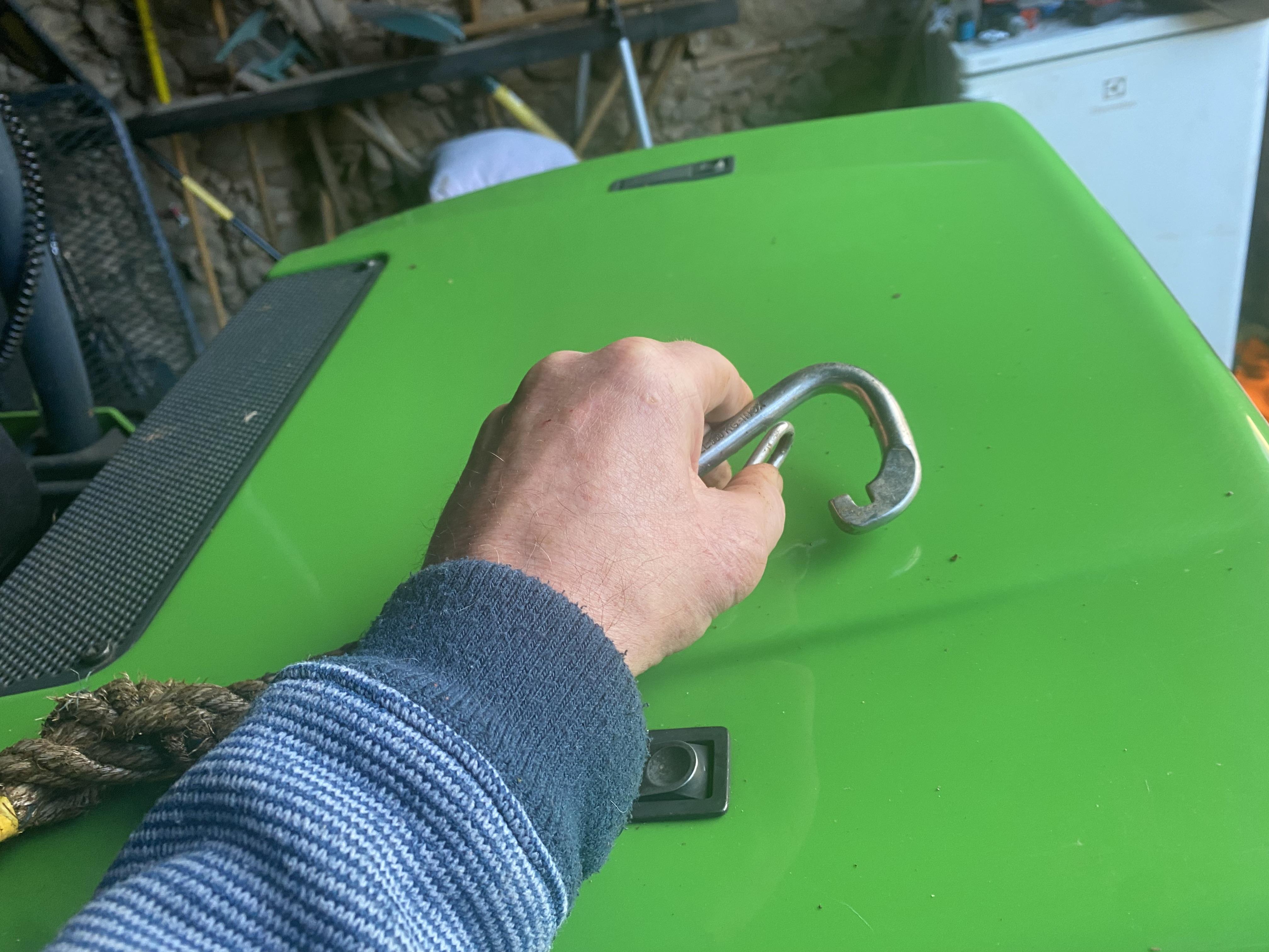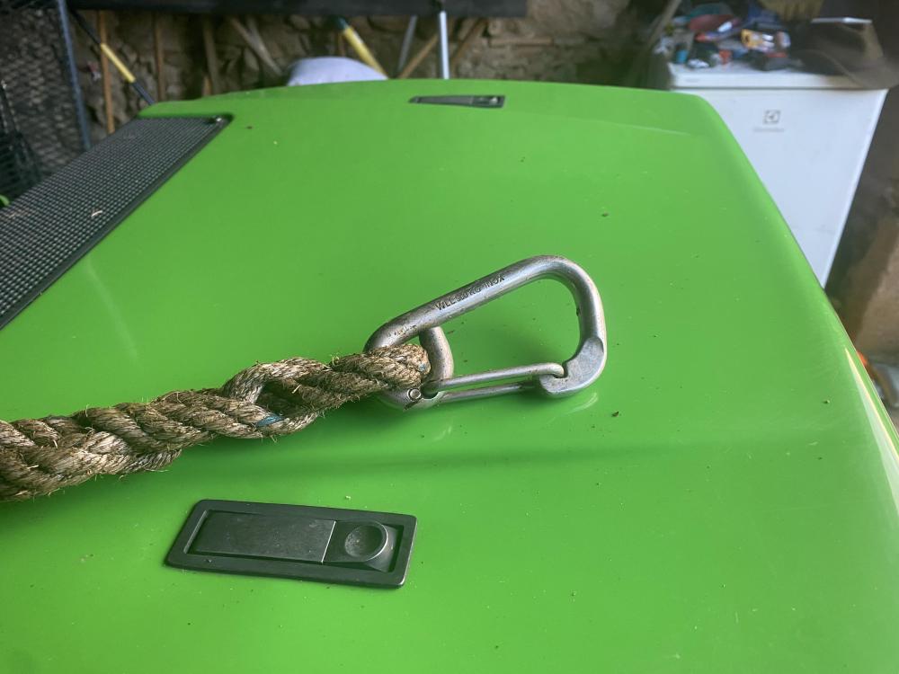 I was by the coast a while back and drifted into a boat equipment shop. Picked up this krab for no real reason. It has been knocking around my climbing gear for a few months, then I had the idea of using it for rigging and it’s absolutely brilliant. Really easy to cinch in the tree and uncinch on the ground, wide gate, easy to open with a thumb though it’s a strong spring action. Heavy, so throws nicely into forks difficult to reach. Fixed eye (as you can see) so neat and tidy. Rated at 900kg so not for mega stuff (neither is the rope of course) It really is very good, wish I’d thought of it years ago.