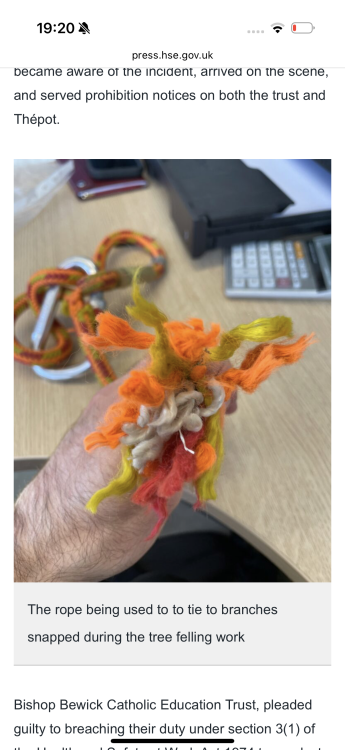 School trust fined after member of public hit by falling tree branch – HSE Media Centre PRESS.HSE.GOV.UK When your retarded enough to use an old climbing line or something not rated for the job… can’t believe he only got a suspended sentence considering the amount of time and money the rest of us have to spend on gear , training, insurance , loler and all the other endless crap to get on these sites… and he had f all !!