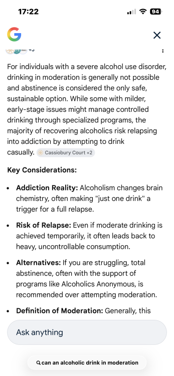It’s good to see you have something to get your teeth into and keep you away from the rape obsession, This your new self appointed role SP/TA Arbtalk anonymous agony aunt. 😂😂😂 Mark must be loving this you discussing his mental illness and health issues every day all in order to try and get one over someone, pretty sure the original post was to Mark but you seem to have taken this one over. See below for accepted norms in regards treatment of genuine alcoholism. There’s also a good deal on heavy flow fanny pads there for you too 👍👍 It's important to remember that a former alcoholic even if they have been sober for a long time, is still in recovery (there is no such thing as an ex-alcoholic). Recovery is a lifelong process, and the person will need strong support and encouragement every step of the way.19