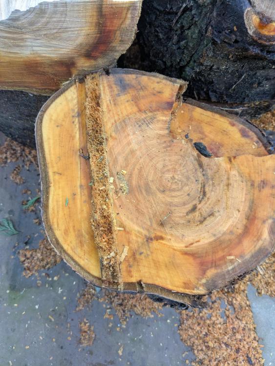 Cherry that got felled the other day. Used the good old Danish pie cut, and definitely was not using a top handle saw on the ground 😋