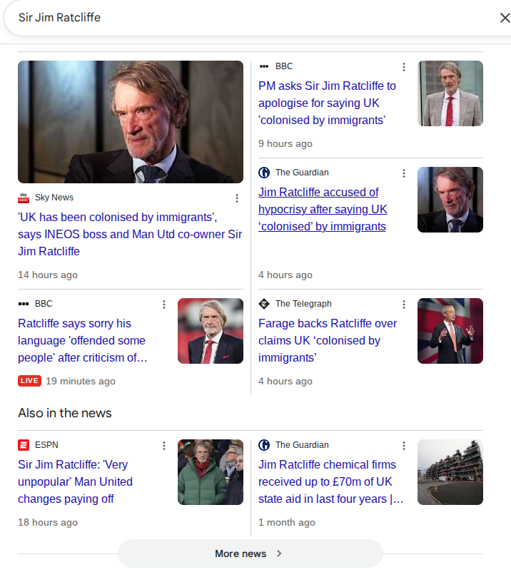Sir Jim Ratcliffe - good to see one of UK's most successful businessman speak out about immigration. I suspect King Charles probably also has similar feelings, but wouldn't dare say anything - this is why the monarchy stinks. It doesn't really matter if the colonists 'win' and outbreed the white honkeys and eventually take over. Khans in every public office. It's all nature - they are like grey squirrels that's what Farrage should say - non white people are like grey squirrels