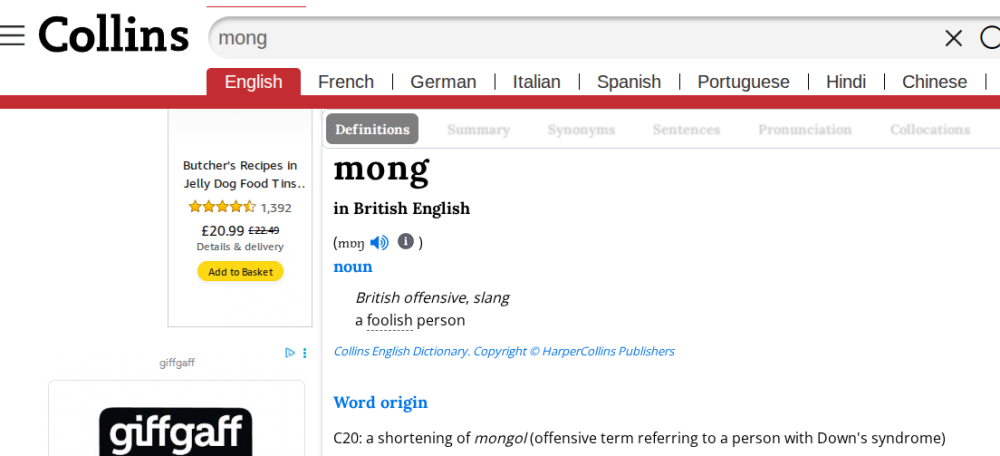 No, you mong - British offensive slang for a foolish person, despite the origins the modern meaning has evolved. Even Ricky Gervais knows it has a slang meaning "The modern use of the word mong means 'dopey' or 'ignorant'," said Gervais in a statement. "It's even in modern slang and urban dictionaries." Ricky Gervais criticised over Twitter 'mong jokes' WWW.BBC.CO.UK Disability group Mencap criticises Ricky Gervais for using the word "mong" on Twitter but the comedian insists its meaning has changed.