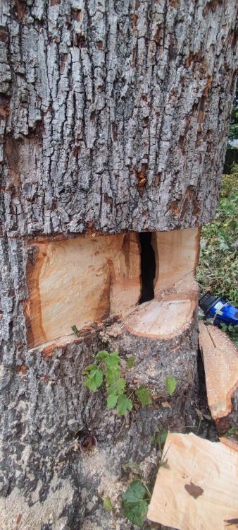 The relatively large lime that I started dismantling a week ago, "small job" for a friend. I've been doing it it half day at a time as I havent felt like doing early starts recently! I was intending to fell the stem, which was too wide for my bar. Due to the rubbish and poor escape route I opted to cut the sides narrower so It could be done from one side. I then discovered it were hollow and I wouldnt get a proper hinge in the direction of lean. Its a heavy lump, so that only left chogging it down in small peices using spikes and a ladder. Currently looks like this, with the stump to come down as low as possible and all the logs cut smaller for firewood, except the two large arch sections that they want as garden furniture. Going back after lunch and should finish it today.