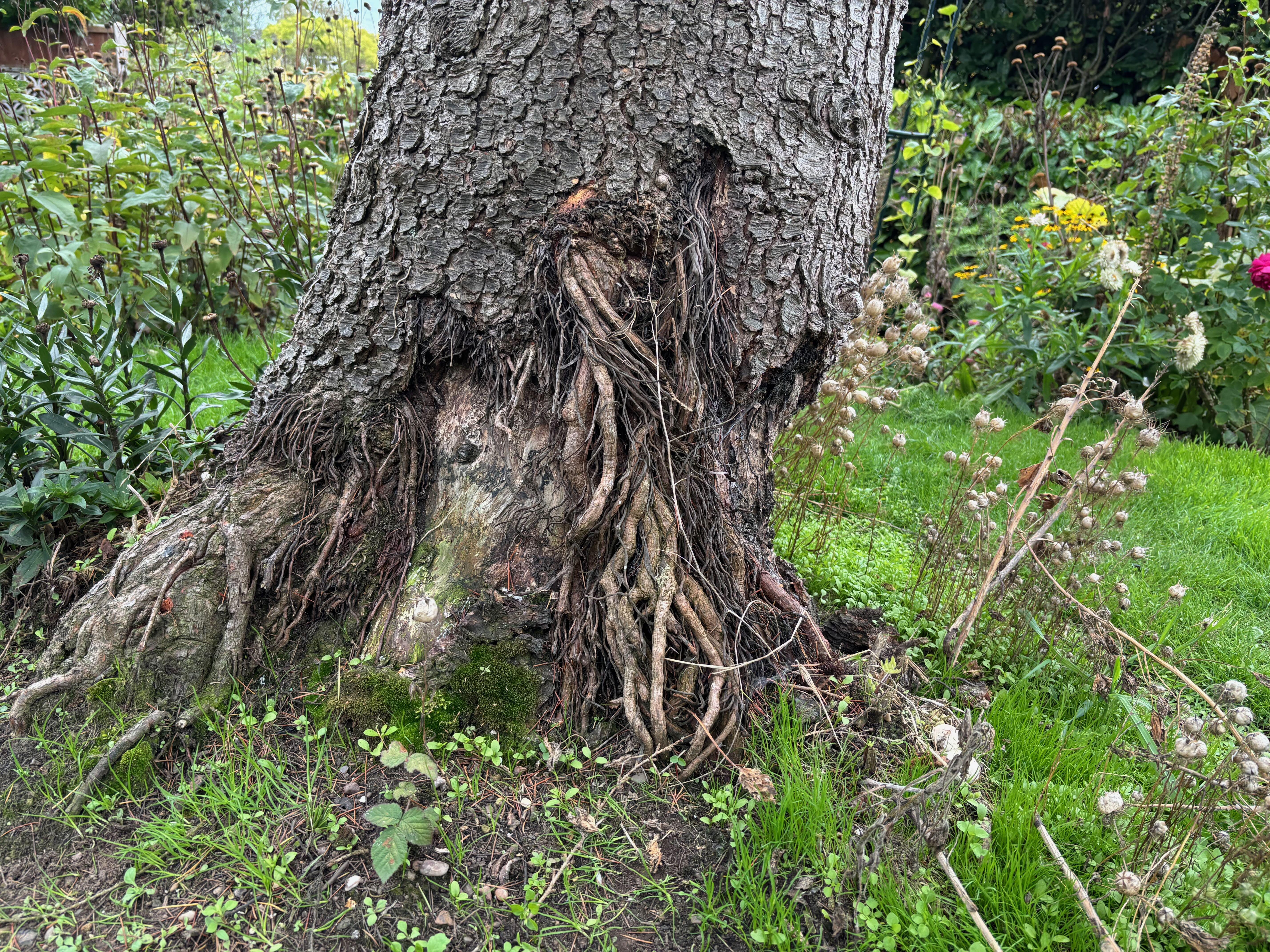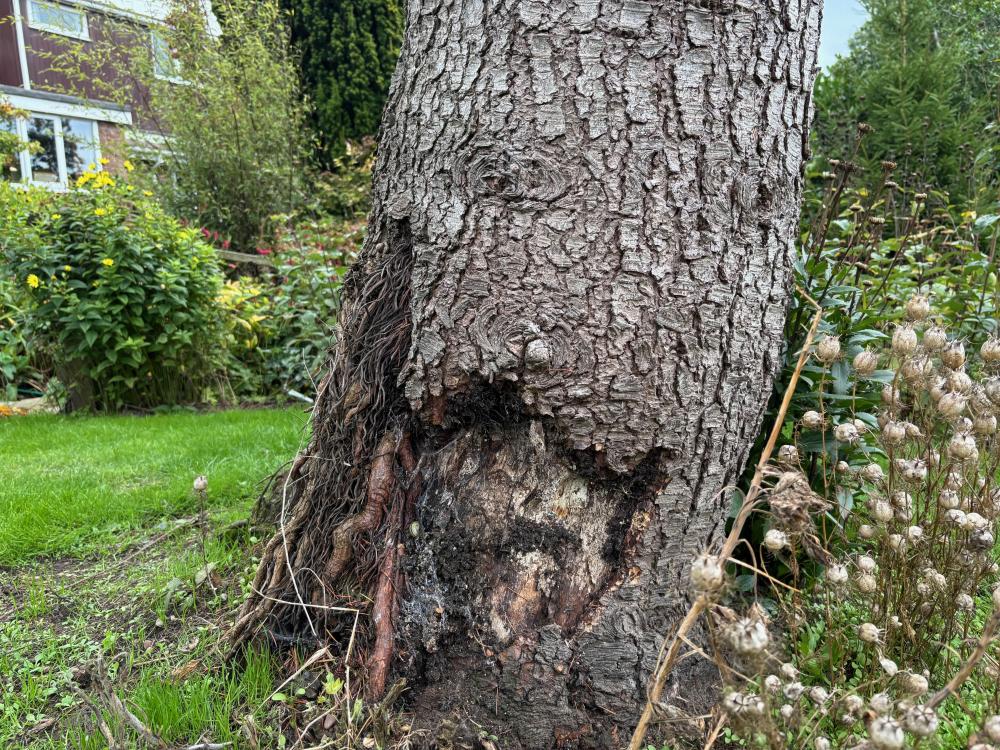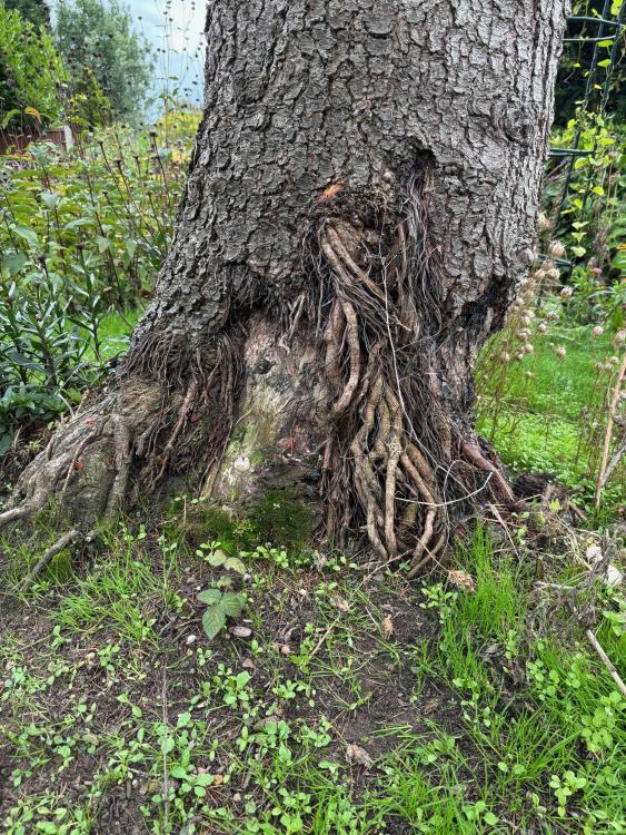 This 40 year old cedar was planted by the current resident. I have never seen anything like this before. On the left side of the photos the root buttress sounds a bit soft/hollow but otherwise the trunk base sounds pretty solid when knocked with nylon head hammer. The fact the tree has a fair lean towards a neighbouring house, and the dubious buttress is the most critical to counter the lean, the owner want the tree down. I think this is the right decision. The crown is not showing any obvious signs of distress/needle loss. Anyone any thoughts on the diagnosis?