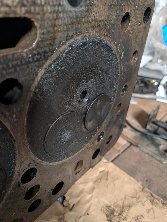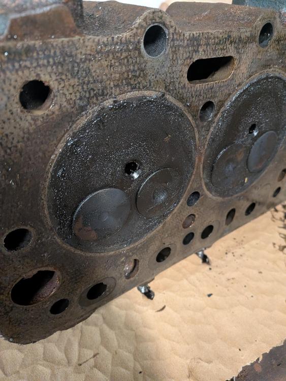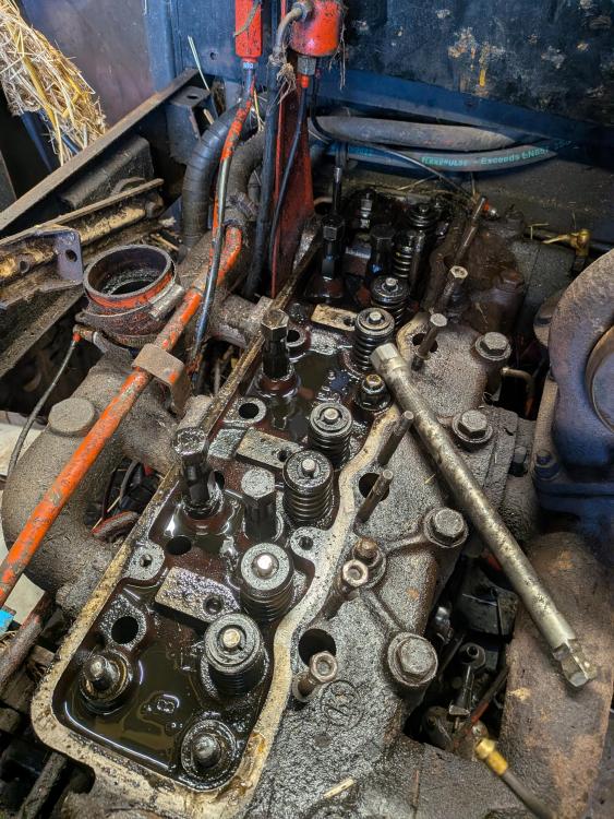 David brown in the surgery. Head off, had to use some ingenuity as I had to get it up and then over the loader arms which are set quite high. Ended up with rope tied of one side of the roof, down the the head and the up to a pulley the other side of the roof and then down to me. Part of the problem was getting the head up and off the long studs off the block. Once off I was hopping I would see a clear reason why I had two bent pushrods on cylinder three, nothing clear cut, no witness marks to indicate the piston had hit the valves.