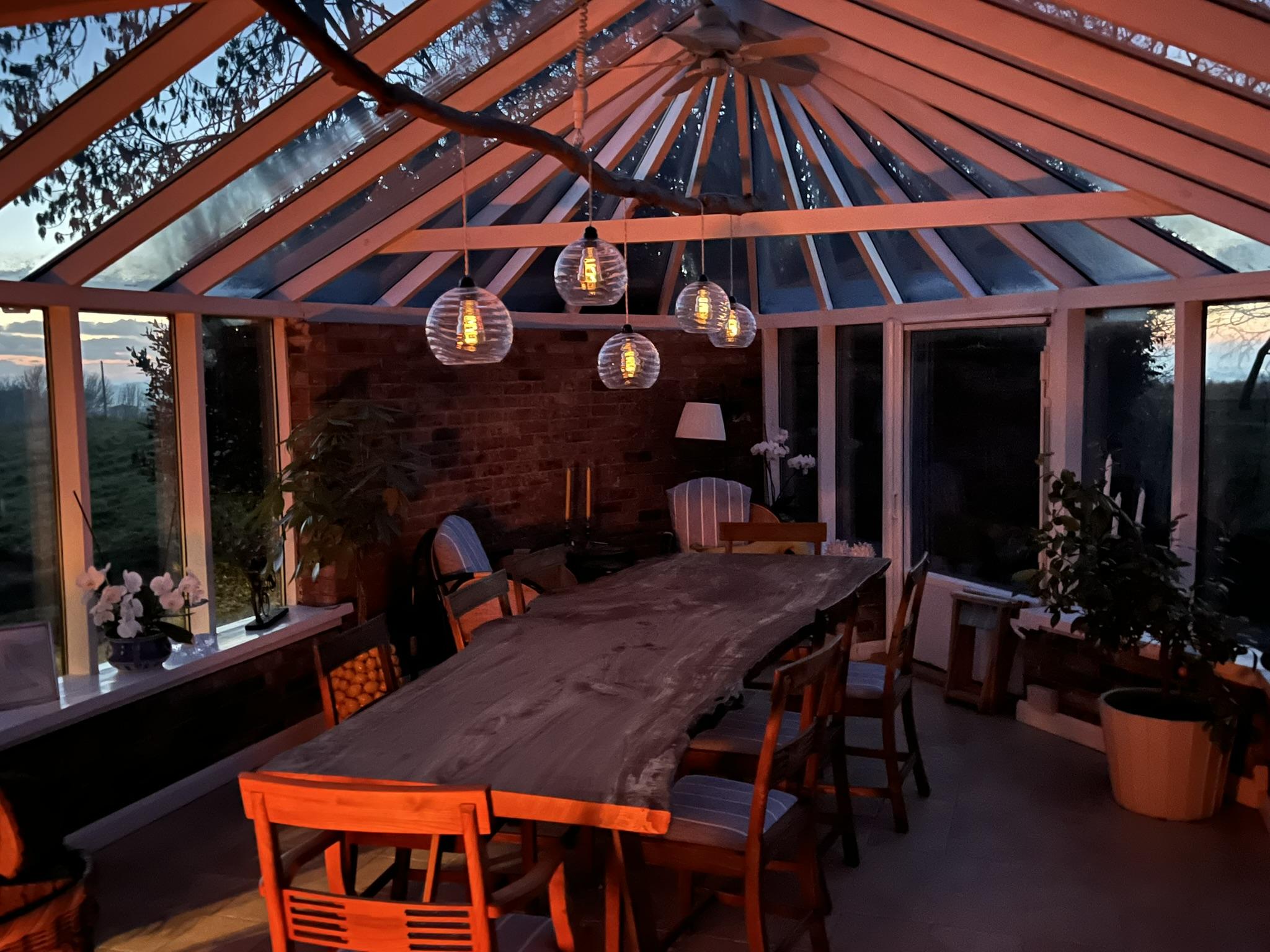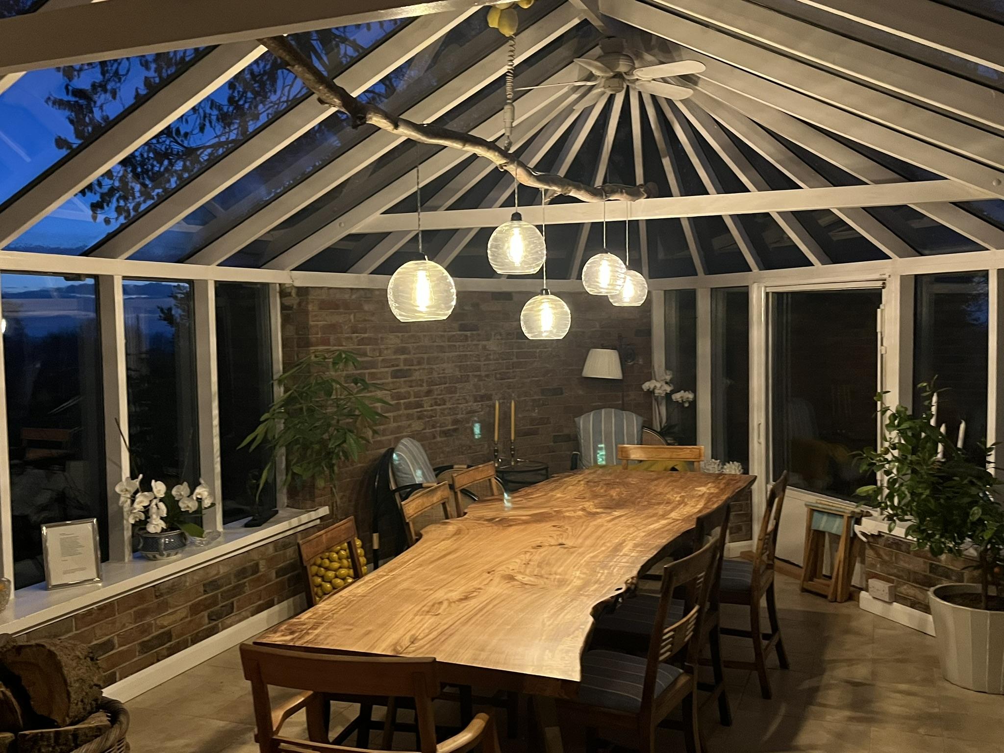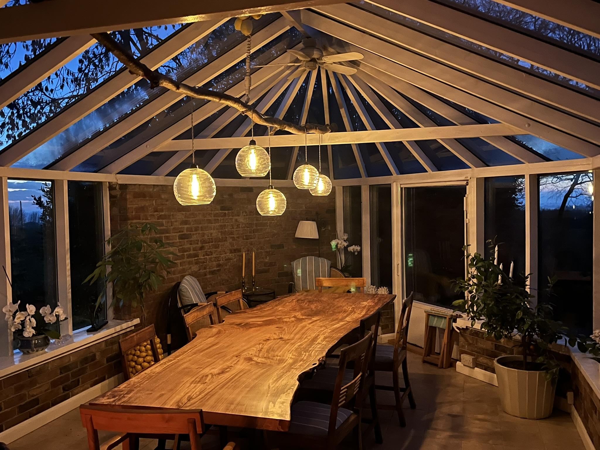 Yeah that is a lovely room, fair play.  I would say the actual building built from ash is way more impressive than the table.  Not dissing the table at all but many people could do that; few try and construct a real wood conservatory these days.  Well done.