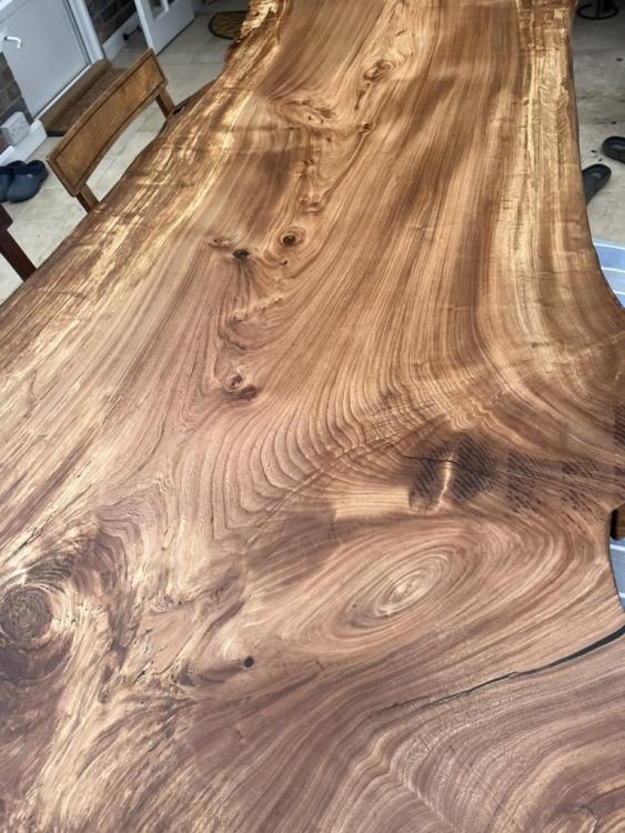 The whole thing has been a big learning curve, from the selection of the English Elm the width of the slab, the first time using the Lucas slabbing attachment, first time sticking the planks and finding an open fronted shed for them to season.  Then first time use of the Lucas planer, which replaces the blade. (very impressed with it) the first time use of sanding attachments which again replace the blade.   Next decision on type of oil to use and decided on Tung oil.  Then there was agony over the choice of legs, wood or metal, different designs,  we started with cross shape but need up with the three legs you see in the earlier photo.  When it came back they suggested it would sit better on two legs which it does, also not interfering with the human legs of the folk sitting in the middle